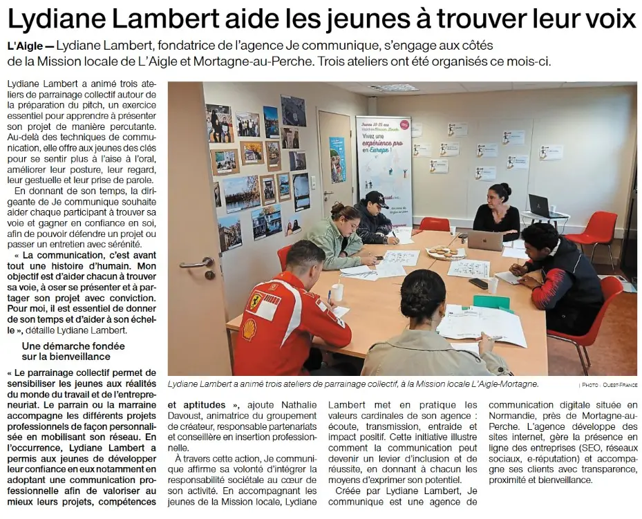 Récemment, elle a animé plusieurs ateliers de parrainage collectif auprès des jeunes de la Mission locale de L’Aigle et Mortagne-au-Perche pour les aider à trouver leur voix, à oser se présenter et à partager leur projet avec assurance.